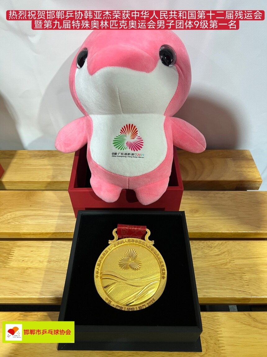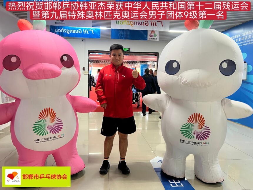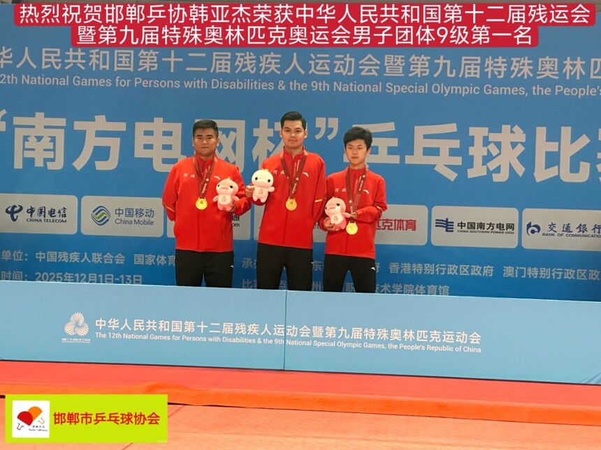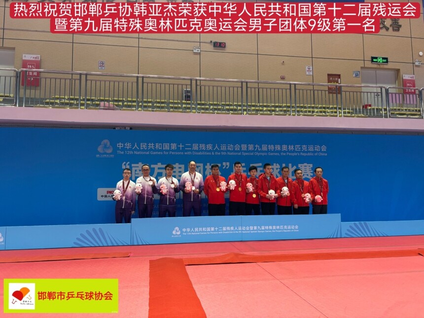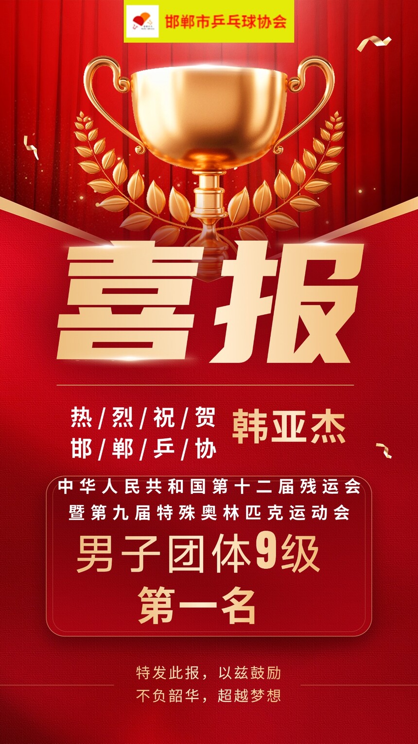 【特大喜报】热烈祝贺邯郸乒协韩亚杰荣获第十二届中华人民共和国残疾人运动会暨第九届特殊奥林匹克运动会乒乓球项目男子团体9级第一名优异成绩。同喜同贺